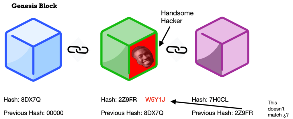 How is blockchain so secure? Well, if a block has been messed with, this will cause the hash of the block to change. In turn, this will make the next block invalid because it no longer has the hash of the previous block (see picture below). However, just hashes alone do not make blocks secure. Hackers can use supercomputers that can produce thousands of hashes per second so that they can tamper with a block and recalculate the hashes of the other blocks to make the chain valid again.